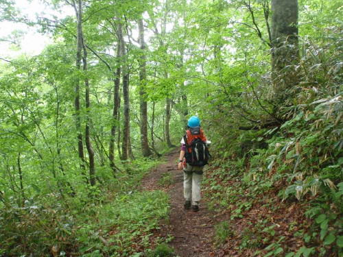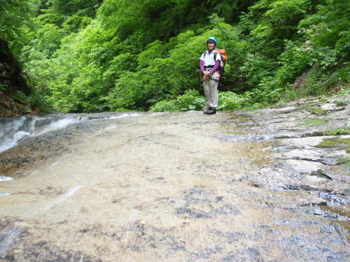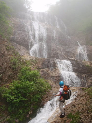 | 先週の水無川本谷で今シーズンの沢幕開けとなり足慣らしをした。リーダー横田川さんは今期初。あまりハードでない、きれいな沢がいいとリクエストしたところ、仙台西の船形山、大倉川・笹木沢に決定。 前夜発、仮眠場所から翌日さらに小1時間、不安になるような山道を小1時間も辿り、やっと入渓点のP到着。先行車1台、あとから釣り人二人連れが到着。林道をくだって大倉川に入渓する。一瞬の笹こぎでも服は真っ黒になる。先行の横田川さんは、すでに竿をだしていた。しばらくは釣り糸をたらしながら遊びつつ遡行。ものの30分で20cm大2匹の釣果。横田川さんは嬉しそう。笹木沢と本谷の出会いからは遡行が本格的になるので竿は一旦格納。笹木沢はグリーンターフといわれる緑がかった沢床で有名だそうだ。綺麗ときいていたが、思ったよりも苔がついていたのと雨上がり+曇天でいまひとつ。ここは水流が勝った沢で、岩とびはあまりない。ナメも多くて美しい。途中何箇所も薄いスノーブリッジをくぐる。スノーブリッジは初めてなので、わくわくしながら不思議なトンネルに驚嘆する。F8まではあまり大きくない滝がいいテンポで続き、飽きさせない。釣り人二人を追い越したあともさらに25cm大1匹、尺モノ1匹を釣り上げて今夜のおかずは確保。F8は結構高さもあったのでザイル。そして核心、20mの鎧滝。これは圧巻だ。ため息が出るような雄雄しく美しい滝だ。左側を登るが、けっこうぬめっていていやらしく、適度なホールド・スタンスはあるものの高さもあるのでザイル。滝の落ち口、潅木をつかんで最後のひと登りというところで、この潅木がごっそり抜けてスリップ。ひやっとした。そのあとは穏やかな渓相と両側に広がるブナのすばらしい林。ブナは本当に美しい。白い幹がまっすぐに空にのびて大きく、包み込まれるような不思議な安心感をもっている。鈴のように満開のベニサラサドウダン、ウラジロヨウラクや、数箇所みかけたシラネアオイも、可憐な風情で風にゆれていた。沢自体は日帰りでも抜けられるくらいの長さだけれど、下山路が厳しいようなので、ほとんど詰めたところで幕場を確保。流木も少なく、濡れた薪から火をおこすのにだいぶ苦労するが、岩魚もこんがり焼け、尺モノは時間がかかるということで岩魚汁に。焚き火でたいた香ばしいご飯とともに最高のディナーだ。これぞ生きる喜び、というと大げさだろうか。夜半、テントをたたく雨の音。もうずっとテント泊は雨ばかり。。。 翌朝も小雨の中、消えずに残っていた熾きから焚き火復活。炊きたてのお米を混ぜご飯のモトでいただき、出発。すぐに雨は上がる。最後まで滑床と綺麗な水を残す沢は、源頭部では日本庭園のような瀟洒な美しさをたたえている。詰め上がりも、泥も藪もない素敵な沢のまま終わり、登山道にとびだす。両側に広がる深いブナ林や咲き乱れる桃色のタニウツギ、ベニサラサドウダン、苔桃などの花々に歓声をあげつつ楽しく歩く。が、楽しいのはここまで。ルートファインディングは難しく、本谷へ下降するため道なき道をコンパス頼りに分け入る。急なガケをブッシュ頼りに滑り降り、少しだけ本谷を下降。一番距離の短いブッシュ付きのガケに狙いを定めてリーダーのトップで3ピッチほど登攀。ドロ壁はすべるしかなり悪いが、なんとか地図上の林道にでた。・・・はずだが、どうみても背丈以上の潅木の自然林で道とはいえない!と私は主張する。が、足元は確かに平らでバラスの痕跡もある。間違いないらしい。こんなものが地図に立派に載っている「林道」なんて初心者の私には絶対にわからなかったろう。ひたすら激しいヤブコギをしながら雨後の木々で全身ずぶぬれになって1時間ほど歩くと、記録にあった「落ちた橋」にたどりつく。しかし谷は眼下遥かで「懸垂むり?」と思うほど。一瞬青くなったがリーダーのすばやく的確な判断は最適な下降ポイントを見つけてくれる。安心してワンピッチで堰堤下に出る。そこから目の前の小滝を登攀するも、これがぬめりとぼろぼろの砂岩で悪い。ちょっとお助け紐にすがって攀じあがる。そこからやっと藪から開放された道らしい道となる。靴を履き替えてさらに1時間半ほどで車に到着。ずぶぬれ泥んこの服を着替えて一路帰途につく。目当ての温泉は運悪く休業で、くさい沢の匂いのままの帰宅となってしまった。総括として、沢自体のグレードは2級程度だが、下山路の厳しさには上級者の経験に基づく判断が必須と感じた。落ちた橋はかれこれ10年はたっているらしく、当然その先は元林道の残骸でしかないわけだ。ひどい藪で顔も手も傷だらけ。焚き火では髪の毛を焼いてしまうし、すべった岩で膝もすねも傷だらけで、沢登りというものは楽しいけど楽じゃない。。。 【船形山 大倉川笹木沢について補足】・・横田川(L) この笹木沢はナメのきれいなお勧めの沢である。それほど難しくないので初級者でも遡行できる。しかし、